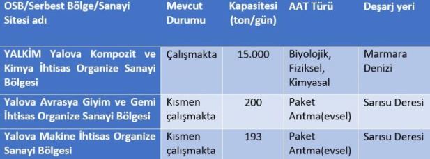 Yalova’da ise OSB’lerden yakın çevredeki derelere deşarj edilen arıtılmış atık suyun günlük debisi 15 bin 393 m3. Bunlarda ileri biyolojik arıtma bulunmuyor. Klasik biyolojik arıtma yapılan atık sularla ekstra toplam azot kirlilik yükü 56 bin 185 kg/yıl ve toplam fosfor kirlilik yükü 30 bin 902 kg/yıl, dereler üzerinden Marmara Denizi’ne gönderiliyor.
